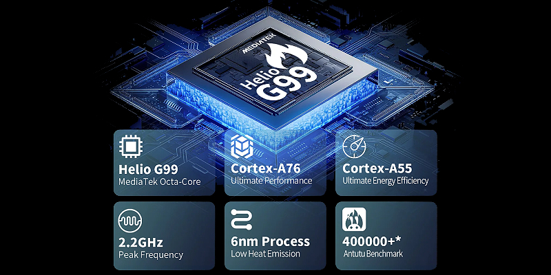 | Processor | Helio G99 Processor (2× Cortex-A76 @ 2.2GHz + 6× Cortex-A55 @ 2GHz) |
