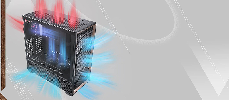 העיצוב כולל פתחי אוויר רחבים בתחתית, בתא ה-PSU ובצדדים,