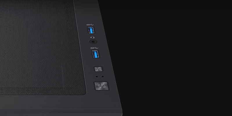 בלוח ה-I/O תמצאו שני חיבורי USB 3.0, חיבורי אודיו לאוזניות ומיקרופון, כפתור איפוס וכפתור הפעלה — כל מה שצריך נגיש ונוח לשימוש.