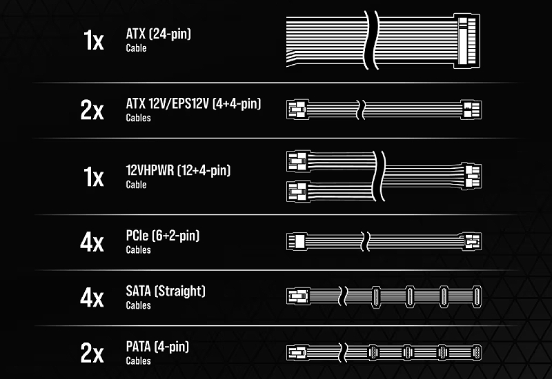 ספק הכוח והכבלים יתאימו לכל מארז מחשב התומך בפורמט ATX PSU ורוחב של לפחות 210 מ"מ (8.3 אינצ').