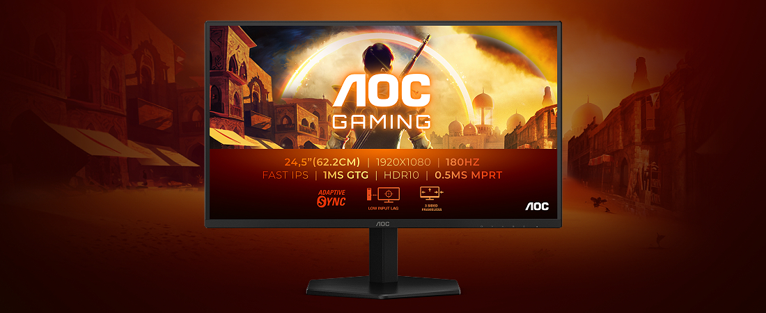 | Revew | AOC 25G42EThe AOC 25G42E model in 24.5 inches offers Full HD (1920x1080) resolution and an impressive 180Hz refresh rate, ensuring ultra-smooth motion and exceptional clarity in every game genre. A Fast IPS panel with a 1ms GtG response time delivers immediate responsiveness and preserves sharp details even in ultra-fast scenes. With AdaptiveSync, low input lag, and HDR10 support, the monitor combines competitive performance with rich, colorful, and realistic image quality. The adjustable stand lets you find the ideal viewing angle for gaming marathons, while MBR (MPRT 0.5ms) and support for AOC’s G-Menu software elevate the gaming experience to the next level of control and precision. Fast and precise Fast IPS panelUpgrade your performance with a Fast IPS panel delivering just 1ms GtG response time—ideal for fast-paced battles, racing, and competitive shooters. The result: clean motion, minimal motion blur, and preserved sharpness in every frame even when the action is at its peak. In addition, you’ll get vivid colors, excellent uniformity, and wide viewing angles, for an immersive gaming experience that looks great from every direction. G-SYNC compatible for a smooth gaming experienceSynchronization with NVIDIA graphics cards via G-SYNC compatibility reduces tearing and flicker, delivering continuous, stable motion even when frame rates fluctuate. Low input lag — an immediate competitive edgeAOC’s Low Input Lag mode reduces unnecessary processing and shortens the time between your controller or keyboard action and what appears on the screen. This lets you react faster in clutch situations, aim precisely, and win battles where every millisecond counts. HDR10 — depth, contrast, and rich colorsWith HDR10, the monitor displays a wider dynamic range, precise brightness levels, and enhanced contrast for images full of depth and detail. The result is a realistic, immersive experience—every scene feels more alive, and every game world looks more natural and impressive than ever. |