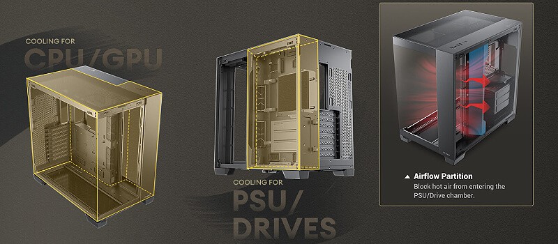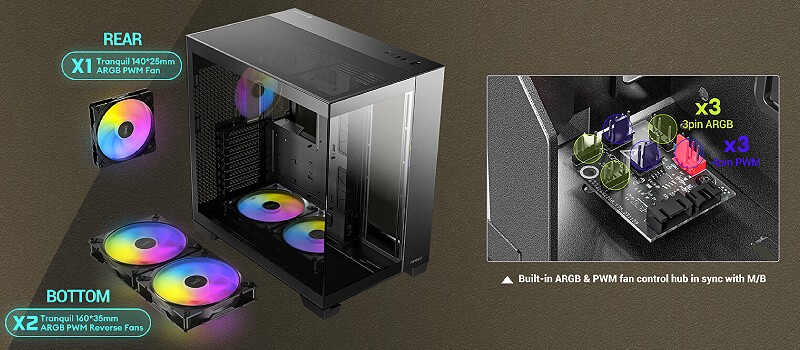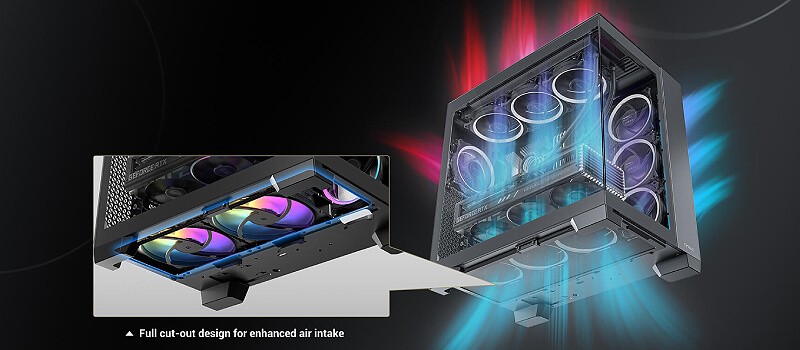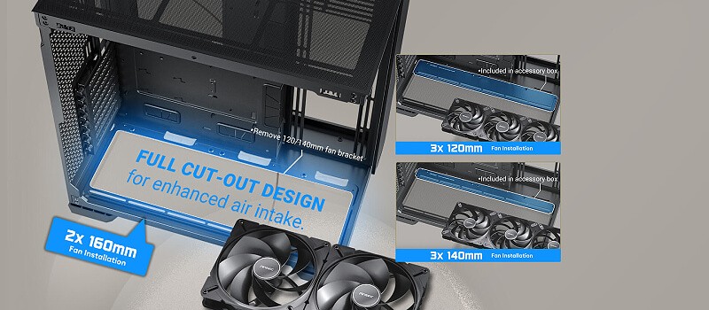 | Revew | Full Display PC Case Smooth and Seamless Edge on Front and Side Panels The front and left panels use a 45-degree angle cutting technique that eliminates the barrier between the two glass parts. The finest edge of the glass connection enhances the panoramic and ultra-transparent visual experience of a 270-degree viewing angle, allowing comprehensive display of advanced computer components and impressive lighting effects. Airflow Vertical Cooling Can accommodate three 120mm/140mm fans or two 160mm fans on both the top and bottom for efficient GPU cooling. Three-Way Fan Stand Bottom Fan Configuration Comes with interchangeable fan stands suitable for different fan sizes. Airflow Dual Chamber Independent cooling for the CPU and GPU on the left side and for the power supply and drives on the right side. Pre-installed Fans 2x 160mm ARGB PWM Fans + 1x 140mm ARGB PWM Fan Refined Craftsmanship Minimal gap between the fan frame and blades for maximum operational efficiency. Reversed 160*35mm Fan An air barrier with a distinct ring surrounding the fan blades improves airflow and stabilizes the fan structure, accompanied by 8 shock-absorbing feet to prevent resonance. Ultra Cooling Best Cooling Design Supports 360mm radiators at the top, bottom, and side simultaneously with liquid cooling. Ultra Cooling Massive Space for Extreme Liquid Cooling The top, bottom, and right side support thick 360mm radiators, providing exceptional capacity and cooling. ![]() Cooling Compatibility Best Cooling Design