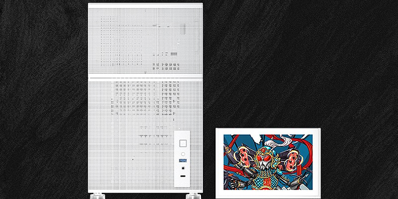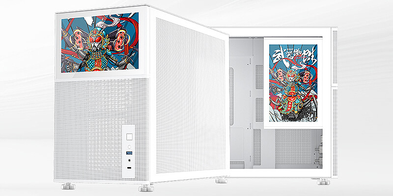 One screen, two uses!The screen can be removed and placed on the work desk for multitasking with the main screen, or positioned on the left side of the case. The screen embedded in the panel can be removed and used as an additional screen on the work desk to create a dual display setup. After removing the screen, the cover of the case panel can be replaced with an included metal plate.