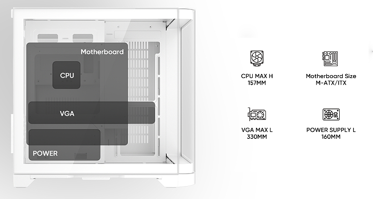 Revew | 1StPlayer UV5Frameless Panoramic ViewU-shaped glass at a 30° angle The hardware and build quality can be showcased from multiple perspectives. The multi-angle panoramic design allows for more efficient desktop space planning. The Perfect StructureAir intake from the sides and bottom, with exhaust at the back, facilitates faster heat dissipation. TOP 240mm COOLING FRONT SIDE 2*120mm REAR 1*120mm BOTTOM 2*120mm Up to five fans can be installed at the front, rear, and bottom. A 240mm fan can be mounted on top to create a powerful cooling system. I/O PanelInterior Design |
