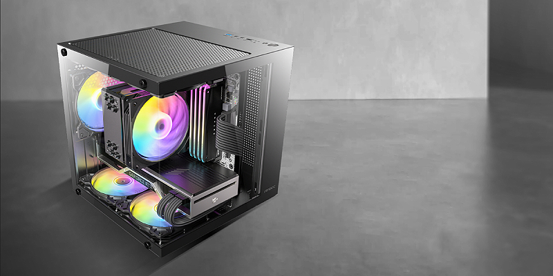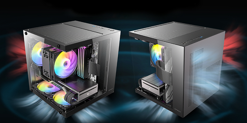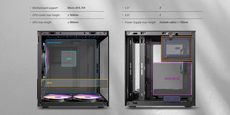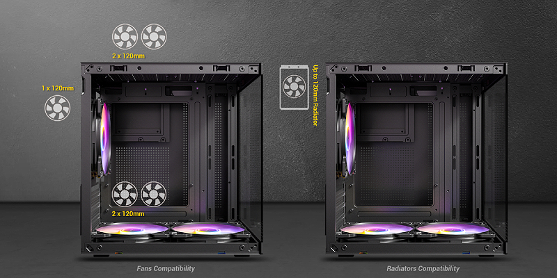 Revew | Enterk VCX10M RGBCompact Design with Advanced CoolingThis case is designed for compact builds, with optimal airflow that provides excellent cooling performance. 270-Degree Panoramic ViewThe glass panels on the side and front offer a clear view of your computer in a modern design. Vertical Cooling with Wide Air IntakeA large amount of air enters through the bottom and side mesh, helping to dissipate heat and prevent overheating of the hardware. 3 Pre-Installed 120mm RGB FansI/O PanelIncludes power button, lighting control button, 1x USB 2.0, 1x USB 3.0, microphone / HD audio. Support for 5 Simultaneous 120mm FansCompatibility with Powerful CoolingMaximum height for CPU cooler: 165mm. Supports most advanced air coolers on the market. Compatibility |