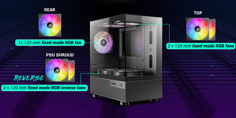5 предустановленных 120 мм вентиляторов с RGB подсветкойСоединены последовательно с блоком питания