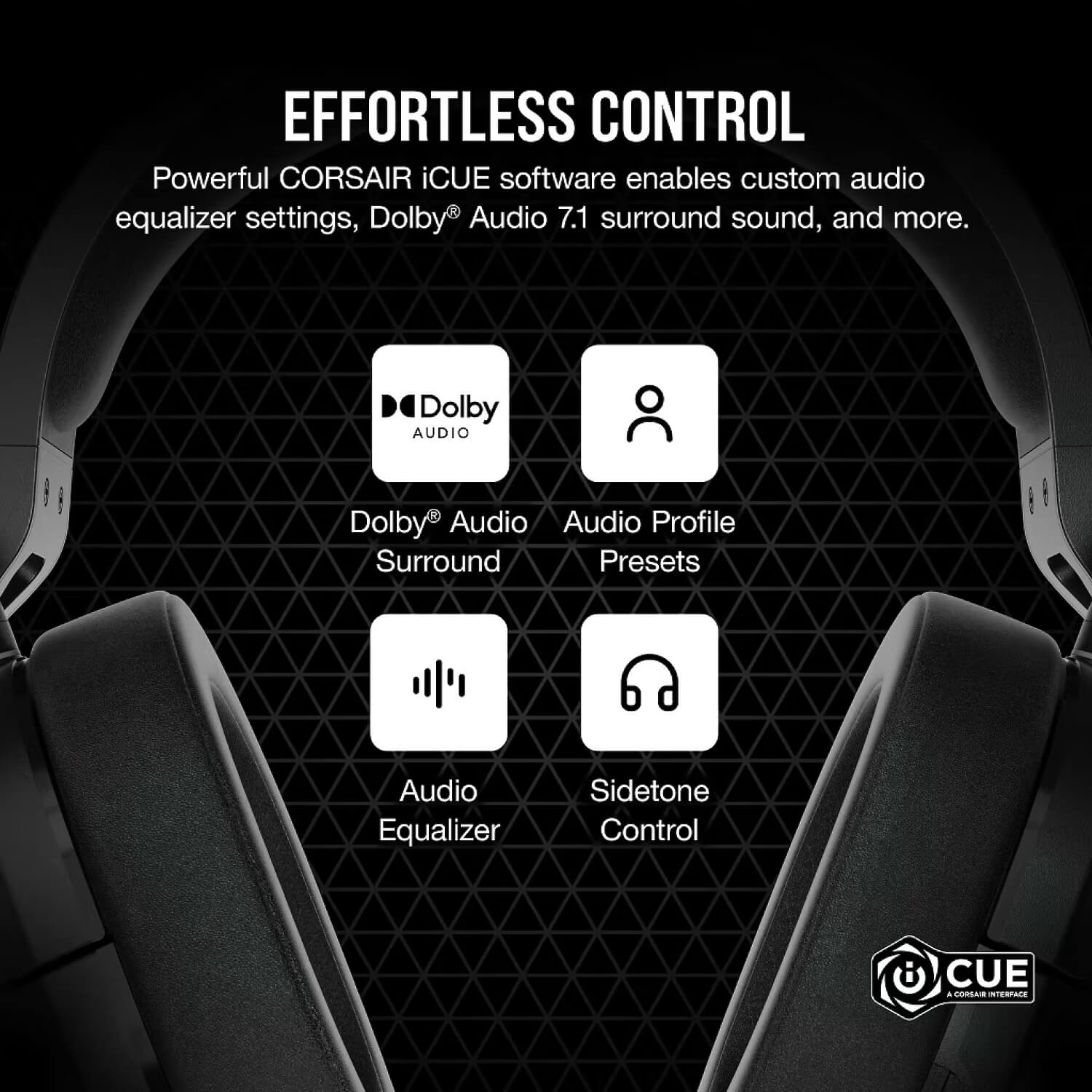 Подключение к любому устройствуВходящий в комплект USB-адаптер обеспечивает объемный звук Dolby Audio 7.1 и доступ к другим функциям через программное обеспечение CORSAIR iCUE на ПК или Mac. Альтернативно, 3.5 мм разъем легко подключается к компьютеру, консоли или другим мобильным устройствам. Легкое управлениеМощное программное обеспечение CORSAIR iCUE позволяет настраивать эквалайзер звука, объемный звук Dolby Audio 7.1 и многое другое.